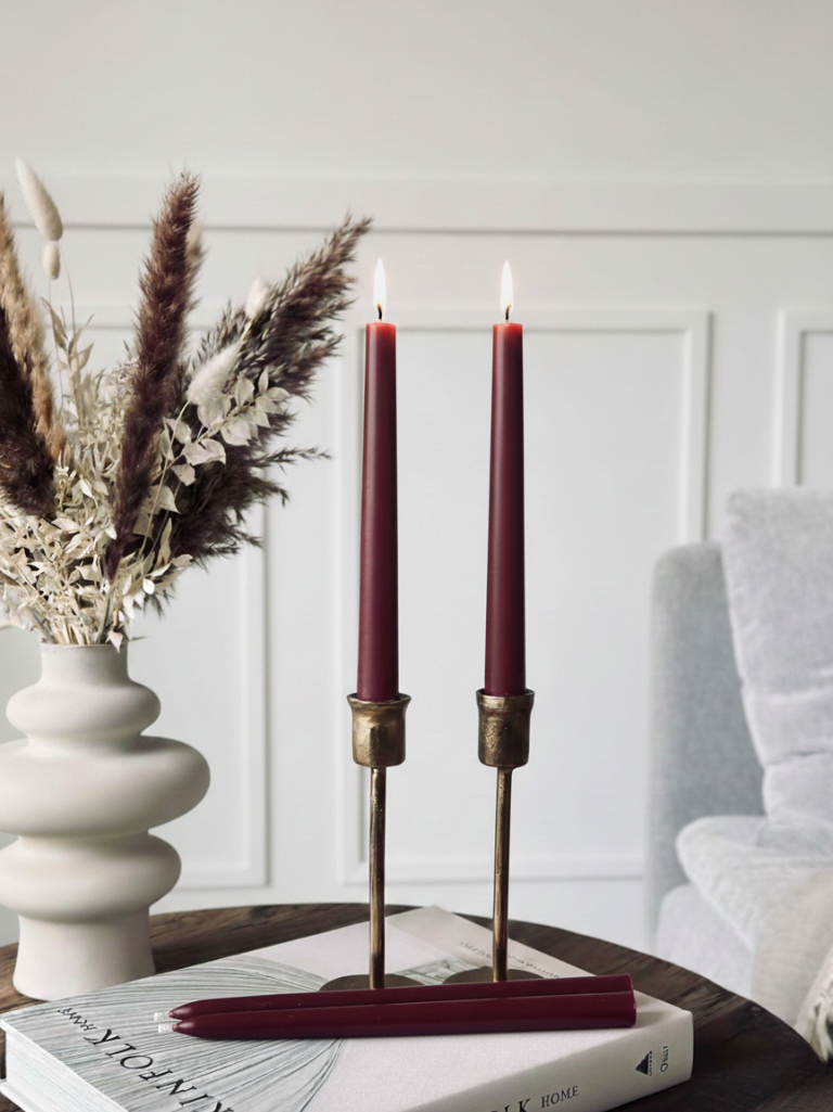 Den dype, varme mørk røde / vinrøde tonen gir et elegant og sofistikert uttrykk, mens bivoksens gylne flamme og subtile honningaroma skaper en atmosfære av ro, varme og raffinert hverdagsluksus. Perfekt til både festlige anledninger og rolige kvelder hjemme.