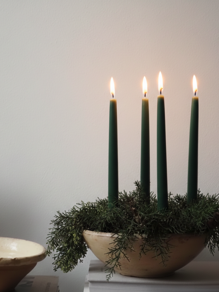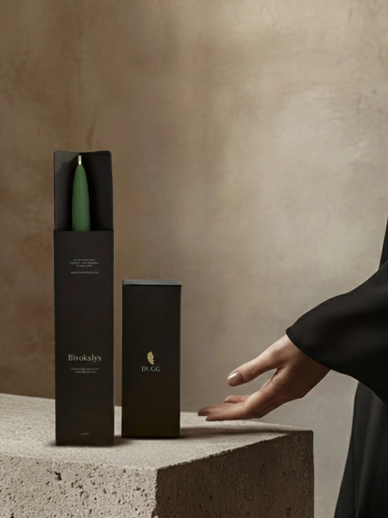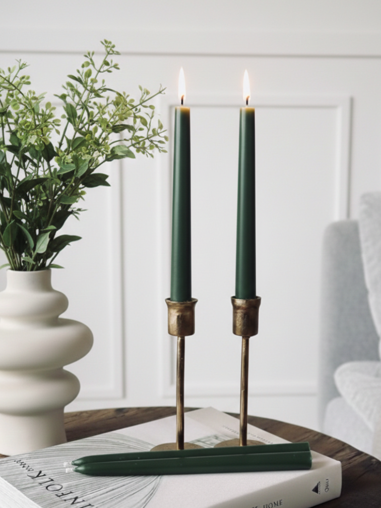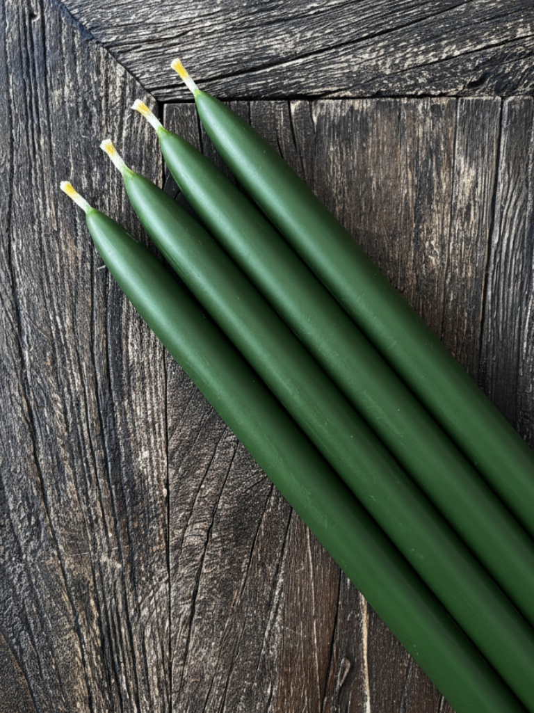 Den dype, rolige mørk grønne fargen er inspirert av natur og skandinavisk ro. Den gir et balansert og sofistikert uttrykk, mens bivoksens gylne flamme og subtile honningaroma skaper en varm, harmonisk atmosfære av ro og raffinert hverdagsluksus. Perfekt til både høytider, middager og stille øyeblikk hjemme.