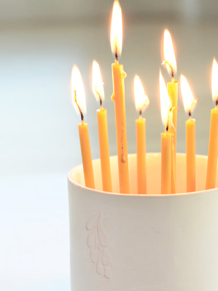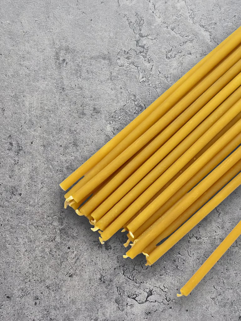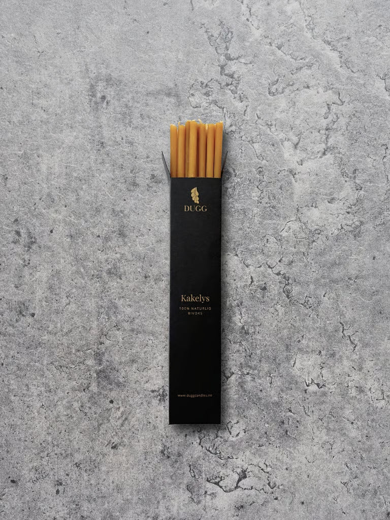 Skap en varm og koselig stemning med våre håndlag, gule kakelys av 100 % ren bivoks. Disse tynne og elegante lysene passer perfekt til bursdager, høytider, middagsbordet eller som en dekorativ detalj i hjemmet.