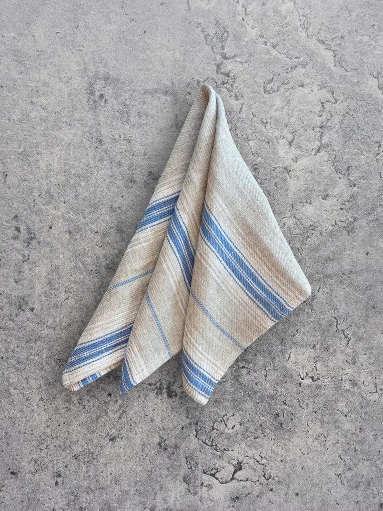En tidløs og elegant serviett i premium 100 % lin som passer perfekt både til hverdags og festlige anledninger. Den naturfargede servietten med klassiske blå striper gir borddekkingen et friskt, stilfullt og tidløst uttrykk. Det mykbehandlede linet har en behagelig følelse, et vakkert fall og et eksklusivt preg som løfter helheten. Kombiner gjerne med våre duker og stearinlys for en komplett bordopplevelse.